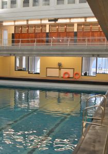Bâtiment de style Art Déco de 1933 installé sur l'emplacement des impasses Geerts, Opdebeek et Gilson, celui-ci fût classé par les Monuments et Sites. Partiellement remaniée en 1960 notamment par l'adjonction d'un décor de panneaux de mosaïques, la piscine subit une nouvelle rénovation depuis 2010.